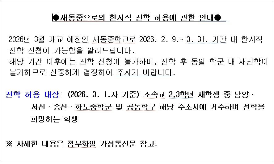 첨부자료1 : 남양·서신·송산·화도중학군 내 신설교(새동중) 한시적 전학 허용 안내.hwp